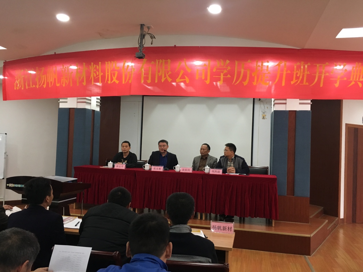 2017年11月13日,在歡聲笑語中,由政府組織、上虞職業中專和我公司聯合開辦的“浙江揚帆新材料股份有限公司學歷提升班”開學典禮在公司二樓培訓室順利召開。