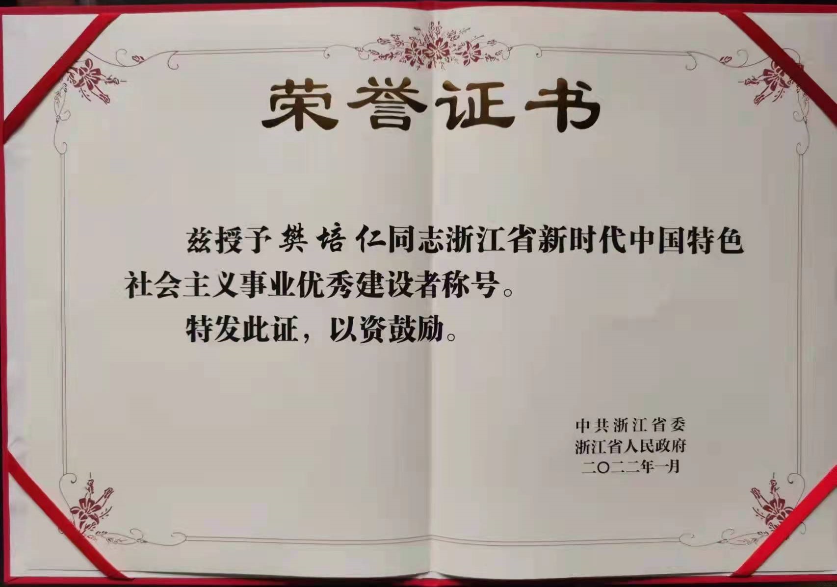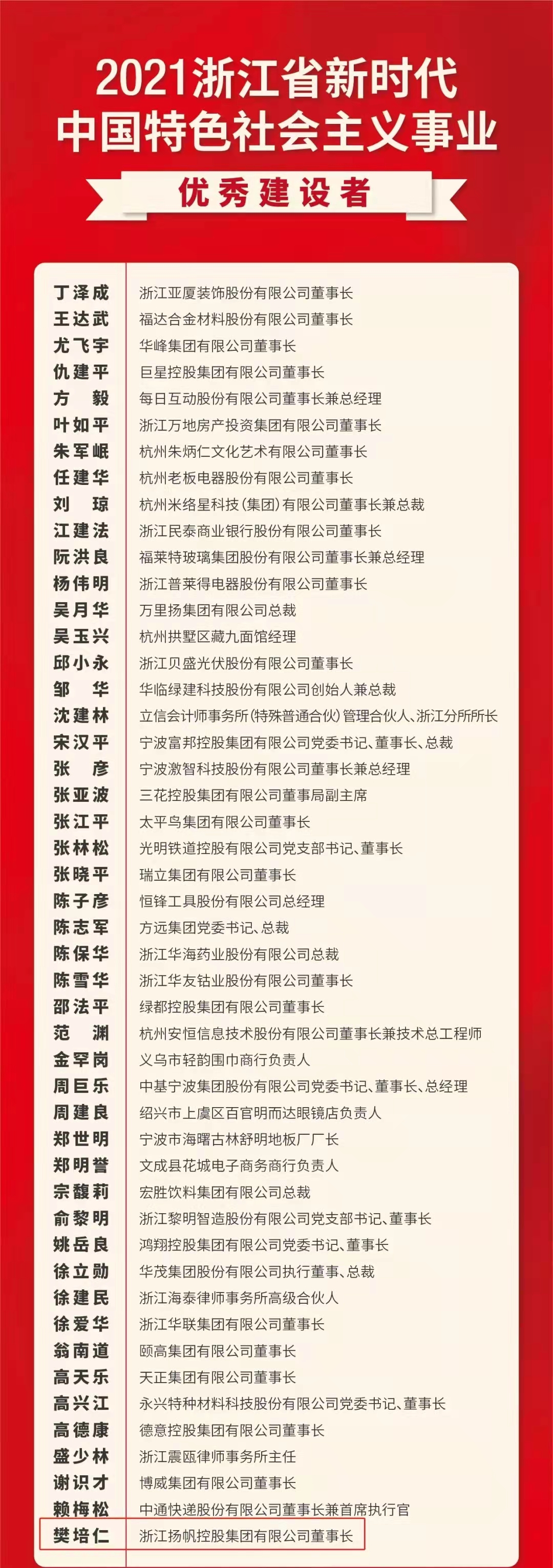 揚帆新材創始人、董事樊培仁先生榮獲“2021浙江省新時代中國特色社會主義事業優秀建設者”榮譽稱號